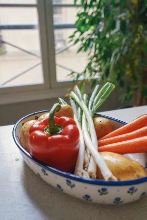 in a medium mixing bowl, whisk together flour and starch for coating. toss in vegetables and coat the exterior of vegetables with a thin layer of the flour mixture